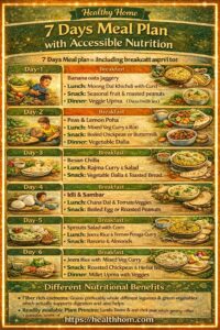 Affordable 7 days meal plan with accessible nutrition using local, seasonal foods. Simple, balanced meals for families on a budget.