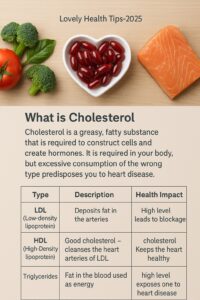 | HDL (High-Density lipoprotein) | Good cholesterol – cleanses the heart arteries of LDL | cholesterol Keeps the heart healthy |